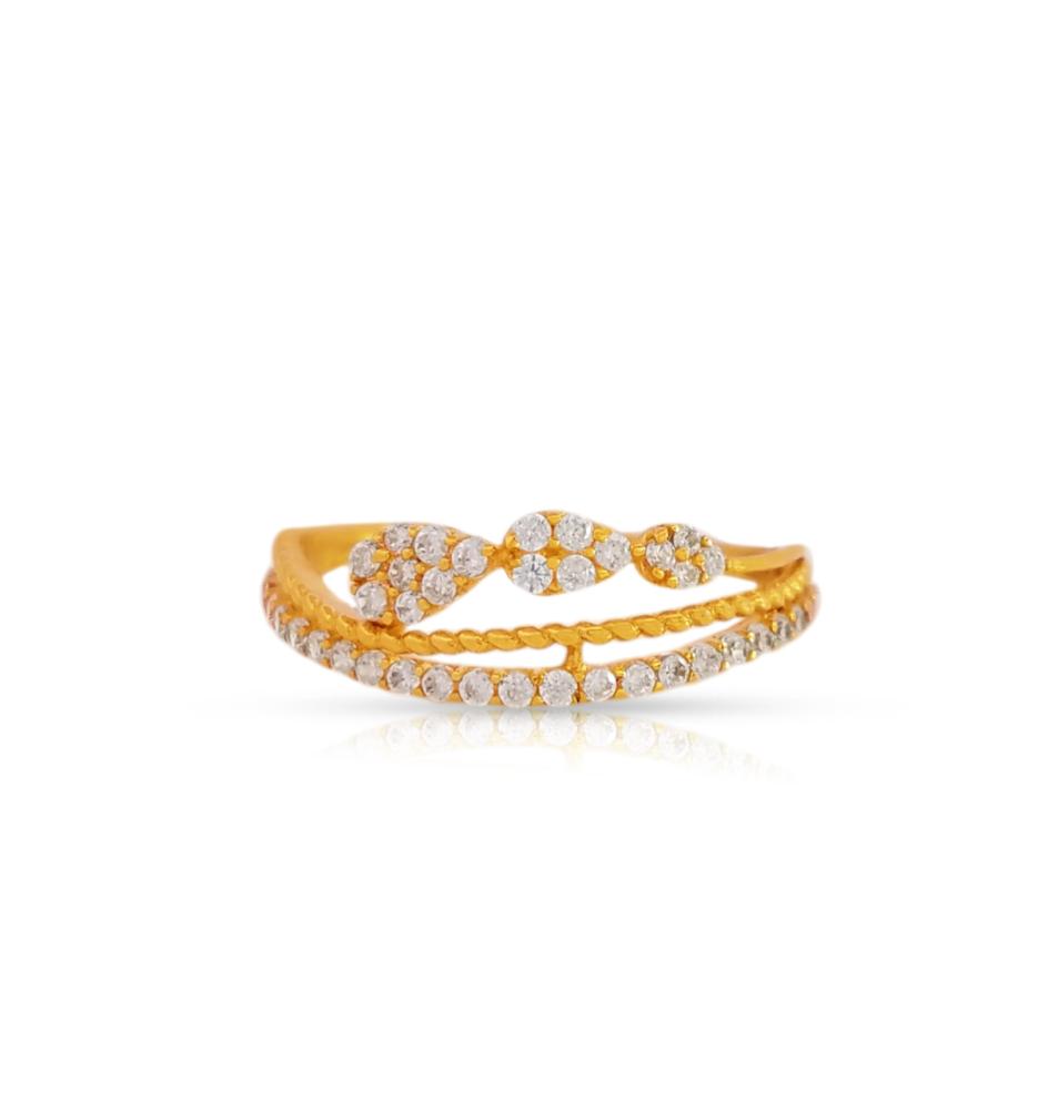 يأتي الخاتم بتصميم "مزدوج الطبقات"، حيث يتكون الجزء السفلي من صف منحني مرصع بالزركون يعلوه صف ذهبي بتصميم "المجدول" (Twisted) يتزين في منتصفه بثلاث ورقات مرصعة بالفصوص اللامعة. هذا التناغم بين الذهب المصقول والزركون البراق يجعله قطعة فريدة تتناسب تماماً عند تنسيقها مع خواتم ذهب أخرى من مجموعتنا المتميزة.
