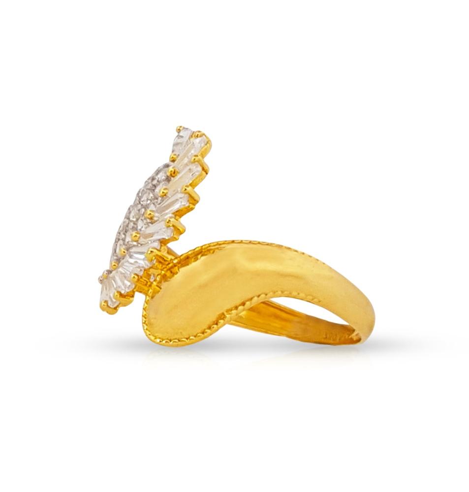 يتميز الخاتم بتصميم انسيابي فريد يلتف حول الإصبع ببراعة، حيث ينقسم إلى جانبين؛ جانب من الذهب الأصفر المصقول بحدود من الحبيبات الدقيقة، وجانب آخر يمثل وردة مرصعة بالكامل بفصوص الزركون. يجمع التصميم بين الفصوص الدائرية وفصوص "الباجيت" الطولية التي تمنحه بريقاً يحاكي أرقى قطع الألماس، مما يجعله يتناغم بشكل ساحر مع خواتم ذهب ناعمة أخرى.
