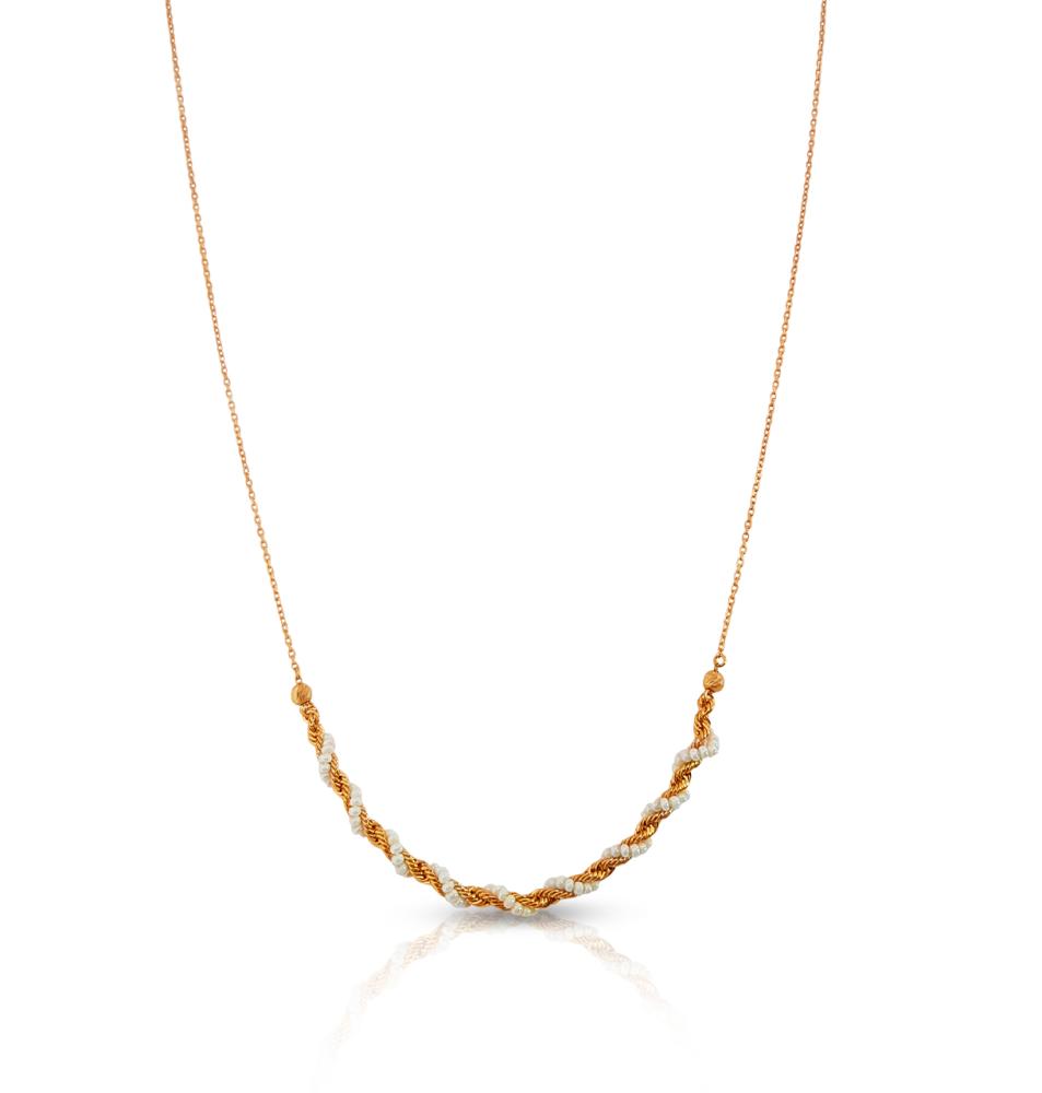 السلسلة الأساسية تأتي بتصميم "Rope Chain" المجدول، المعروفة بتشابك حلقاتها التي تعكس الضوء من مختلف الزوايا، فتمنح القطعة لمعانًا غنيًا وملمسًا بصريًا قويًا.. لكن ما يميز هذا العقد هو خيط رفيع من الخرز الأبيض الصغير (يشبه اللؤلؤ المصغر) ينساب حول أجزاء من السلسلة، في حركة حلزونية ناعمة ومتقطعة، تضيف تباينًا ساحرًا بين دفء الذهب وصفاء اللون الأبيض.