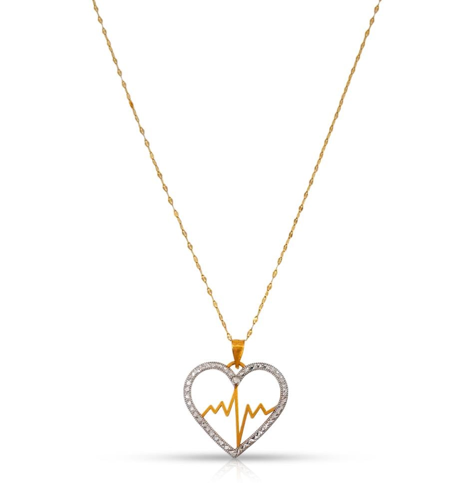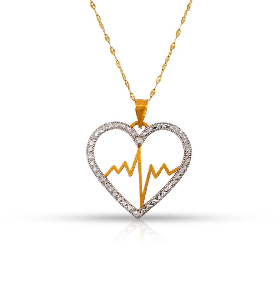 يأتي العقد بتصميم "قلب ونبض" (Heartbeat) جذاب، حيث يتميز إطار القلب بـ زخارف ماسية دقيقة تعكس الضوء ببريق يشبه الألماس، بينما يتوسطه خط النبض من الذهب الأصفر المصقول. السلسلة الذهبية الرقيقة تزيد من نعومة القطعة، مما يجعله يتناغم بشكل رائع عند تنسيقه مع خواتم ذهب ناعمة لإطلالة رقيقة ومتكاملة.