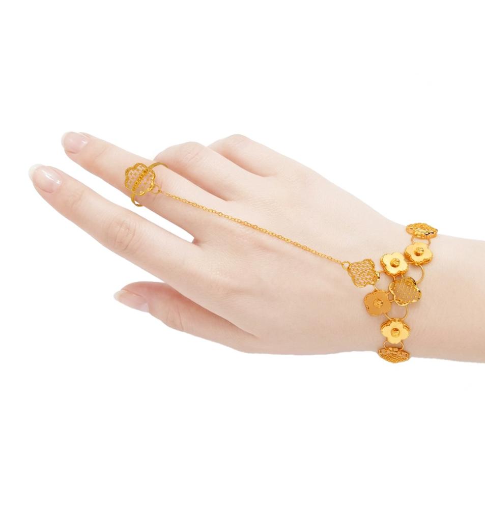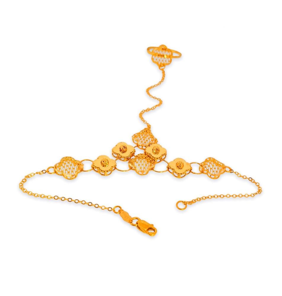 تتميز هذه الإسوارة بشكل "وردات" متصلة، حيث تتنوع كل وردة بين الملمس الرملي المطفأ والزخارف المفرغة التي تعكس الضوء ببريق يشبه لمعان الماس. السلسلة الواصلة بين الإسوارة والخاتم ناعمة جداً لتبرز جمال اليد بأسلوب عصري، مما يجعلها خياراً أكثر مرونة وأناقة من أساور الذهب التقليدية بفضل تغطيتها الواسعة لظهر اليد بوزن خفيف.